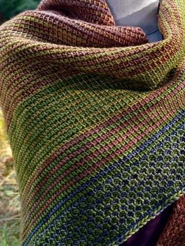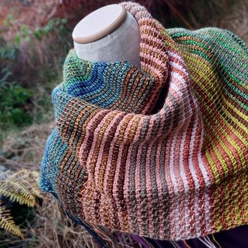 Commissioned shawl, 100% merino. The weight and drape are dreamy. I am so pleased with how this one turned out with its sophisticated colourways. Grateful the client loves it as well!