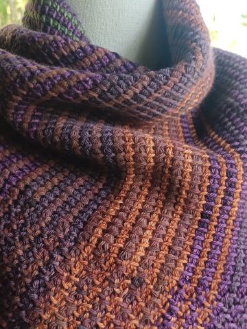 Scalene shawl/wrap (152cm x 140cm x 61cm), 100% merino wool, rich colours of the arbutus--rust and aubergine, Picasso Jasper bead.